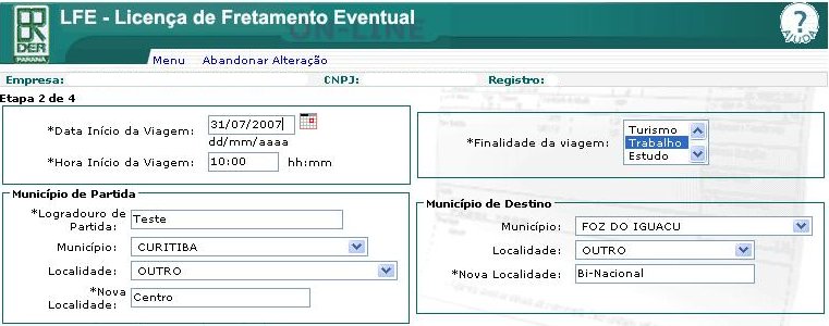 Duração Prevista da Viagem: preencha nesse campo o tempo de duração da viagem entre o município de partida e o de destino.