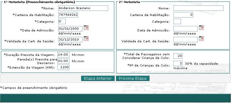 1° e 2º Motorista: nesses campos serão preenchidas as informações referentes aos motoristas. É obrigatório o preenchimento de, pelo menos, o 1° motorista.
